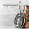 CopperBond Copper Induction Saucepans with stainless steel lids stacked on the right, and two stainless steel frying pans leaning on the left. Text in the top left corner reads: Designed by Michelin-starred chefs in Napa and handcrafted as copper core induction cookware in our Italian factories.