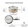 Image of a CopperBond Copper Induction Saucepan, 2-quart with lid: 3 tall without lid, 4.5 with lid, handle length of 13.75, and rim to rim diameter of 7.625. Weighs 3.4 lbs (1.54 kg).