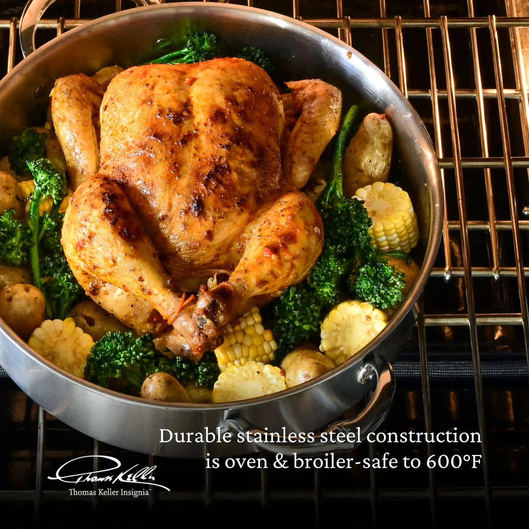 Thomas Keller Insignia delivers 35% greater heat conductivity than other aluminum clad cookware thanks to durable tri-ply construction, combining high-grade stainless steel with exclusive ProCore™ aluminum. The design of our sauté pans creates 20% more cooking surface area.