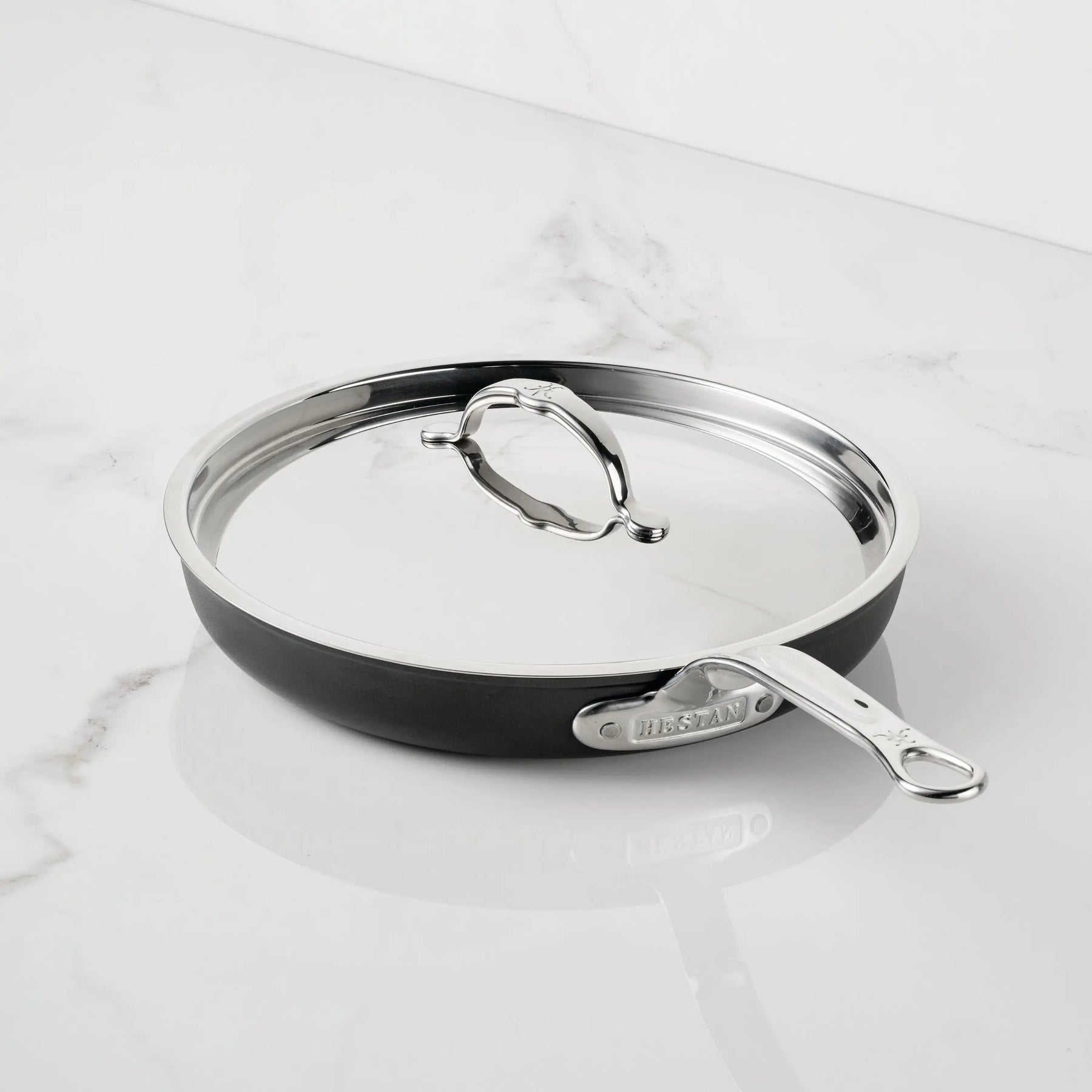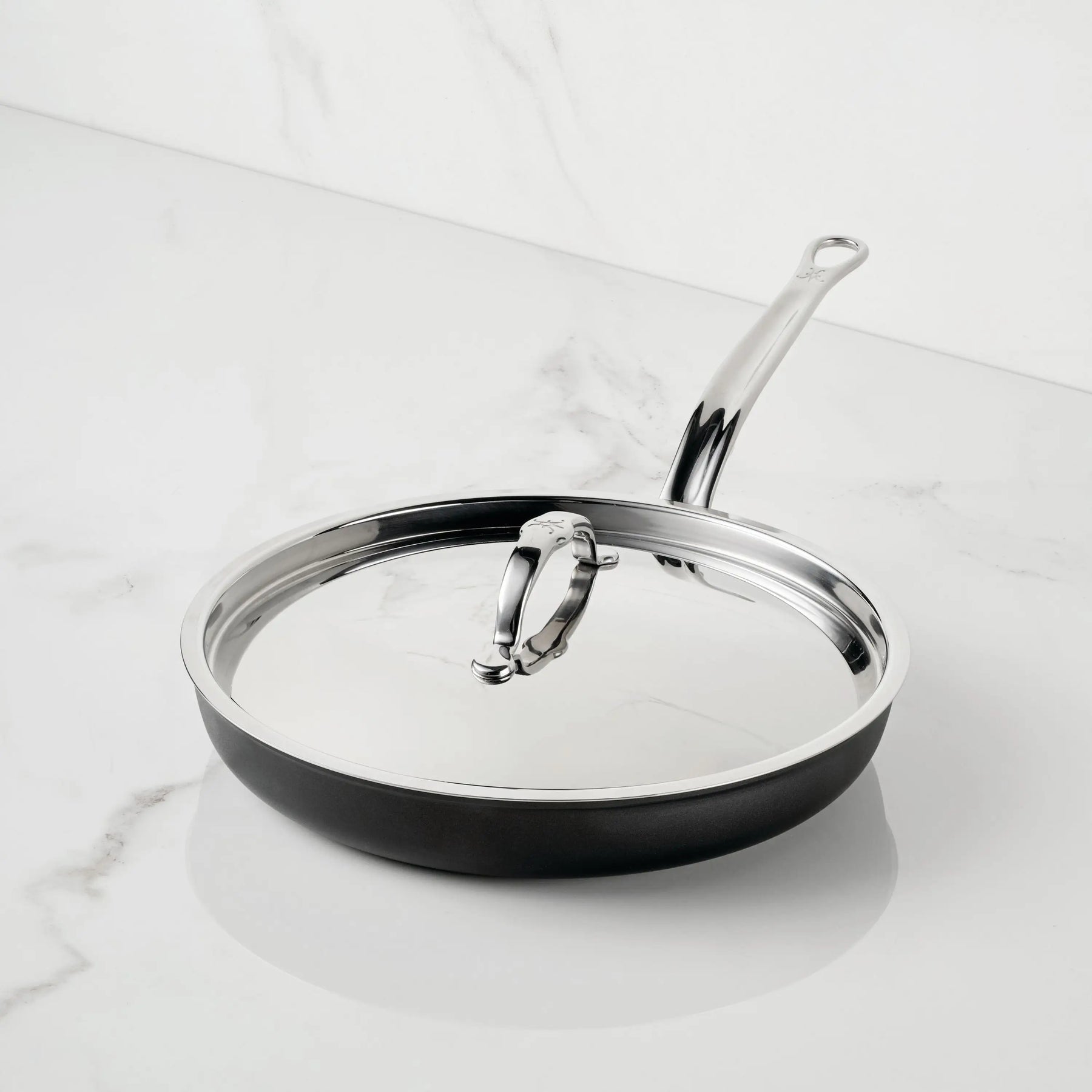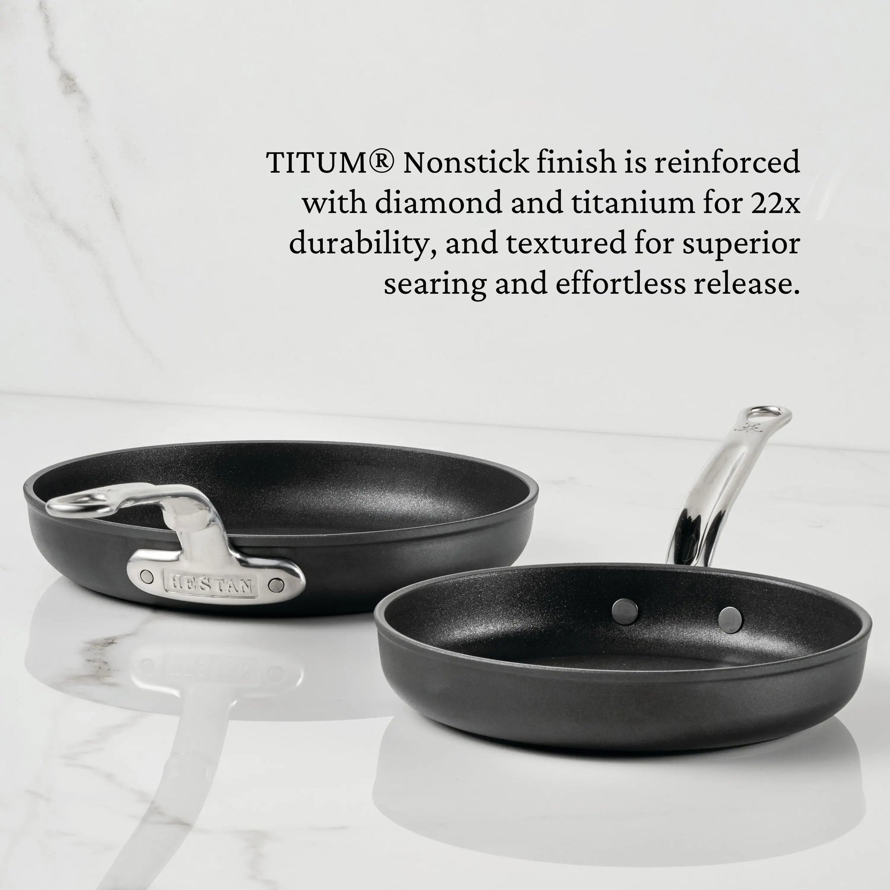 The TITUM® Fusion 11" Nonstick Skillet with Lid is finished with diamond and titanium-reinforced nonstick surface for 22x longer-lasting performance—ideal for everyone's favorite Sunday brunch, quick mid-week scrambled, crépes, seared steak, or a delicate pan-fried fish. This Italian-made nonstick frying pan is thoughtfully designed with chef-preferred features, including a double-impact stainless steel base for lasting warp-resistance, a 30% wider cooking surface compared to ordinary skillets, plus a dishwasher safe construction for convenient cleanup.