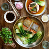 A meal of cooked salmon and bok choy in a pan from the Thomas Keller Commercial Clad Stainless Steel 10-Piece Cookware Set, served with fish fillet in broth, cilantro, radishes, soy sauce, sesame seeds, and water on a wooden table.