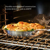 A Commercial Clad Stainless Steel 10-Piece Cookware Set pan from Thomas Keller Commercial Clad holds baked food topped with melted cheese on an oven rack. Text highlights its durable tri-ply build and oven/broiler safety up to 600°F.