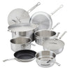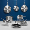 The Thomas Keller Commercial Clad Stainless Steel 10-Piece Cookware Set, featuring frying pans, saucepans with lids, a sauté pan, stock pot, and steamer insert with metal handles, is arranged on a white surface for versatile kitchen performance.
