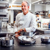 A man in a chef’s jacket smiles at the camera, leaning on a counter in a professional kitchen. In front of him, the Thomas Keller Commercial Clad Stainless Steel 10-Piece Cookware Set gleams among other pots and pans, with shelves behind him.