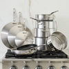 The Thomas Keller Commercial Clad Stainless Steel 10-Piece Cookware Set, featuring pots, pans, lids, and a strainer, is elegantly stacked and displayed on a stovetop against a light kitchen backsplash.