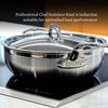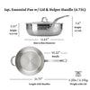 This image features the ProBond Professional Clad Stainless Steel Essential Pan with a tri-ply aluminum core. It has a 5-quart capacity, includes a lid and helper handle, measures 11.65 in diameter, is 3.55 tall (5.6 with the lid), 21.75 long with handles, and weighs 5.2 lbs.