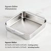 Displayed is a warp-resistant, stainless steel square baking pan with side handles from the Hestan Provisions OvenBond Tri-Ply 3-Piece Baking Set. It measures 8x8x2 for the cooking surface and 11.1x8.8x2 including handles.